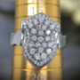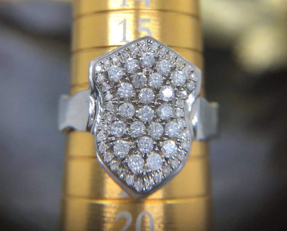 Tegas dan penuh karakter, Titan Valor adalah cincin emas putih 16 karat dengan taburan berlian alam dalam pola perisai yang maskulin dan mewah. Desainnya yang simetris dan solid memancarkan kekuatan, status, dan keberanian.