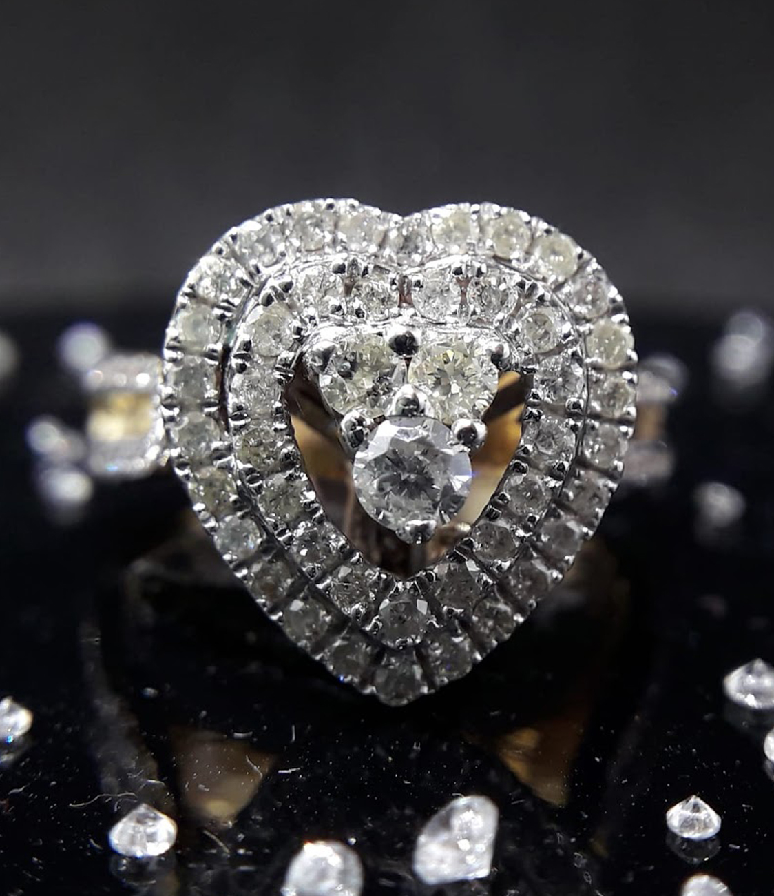 Cincin ini memiliki desain berbentuk hati yang elegan, dihiasi dengan berlian alami yang berkilauan. Bagian tengahnya menampilkan satu berlian utama yang menonjol, dikelilingi dua lapis berlian kecil yang tersusun rapi, menciptakan efek mewah dan glamor. Terbuat dari emas putih, cincin ini cocok untuk momen istimewa seperti lamaran atau hadiah romantis.
